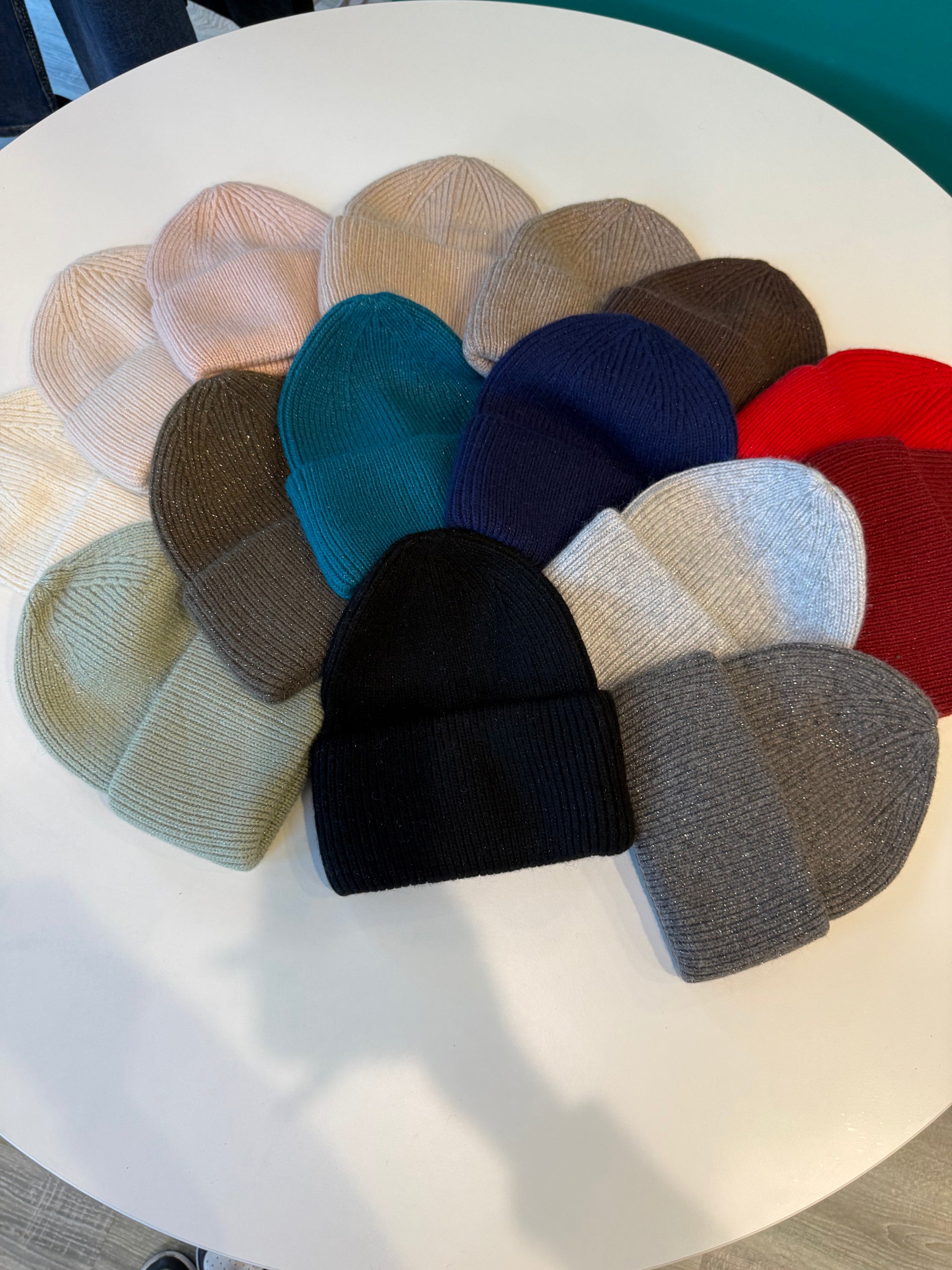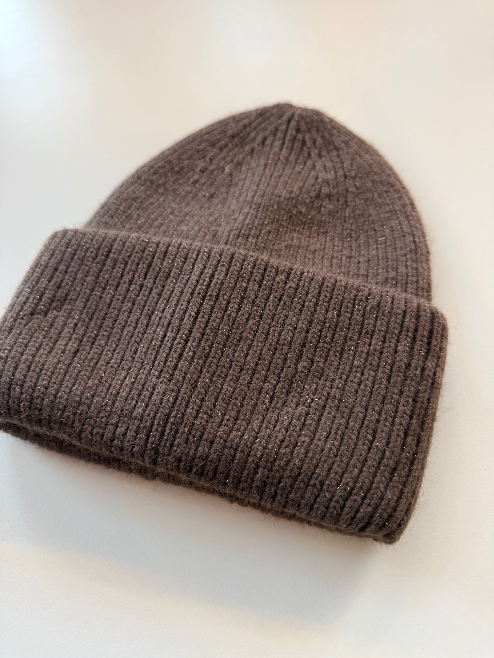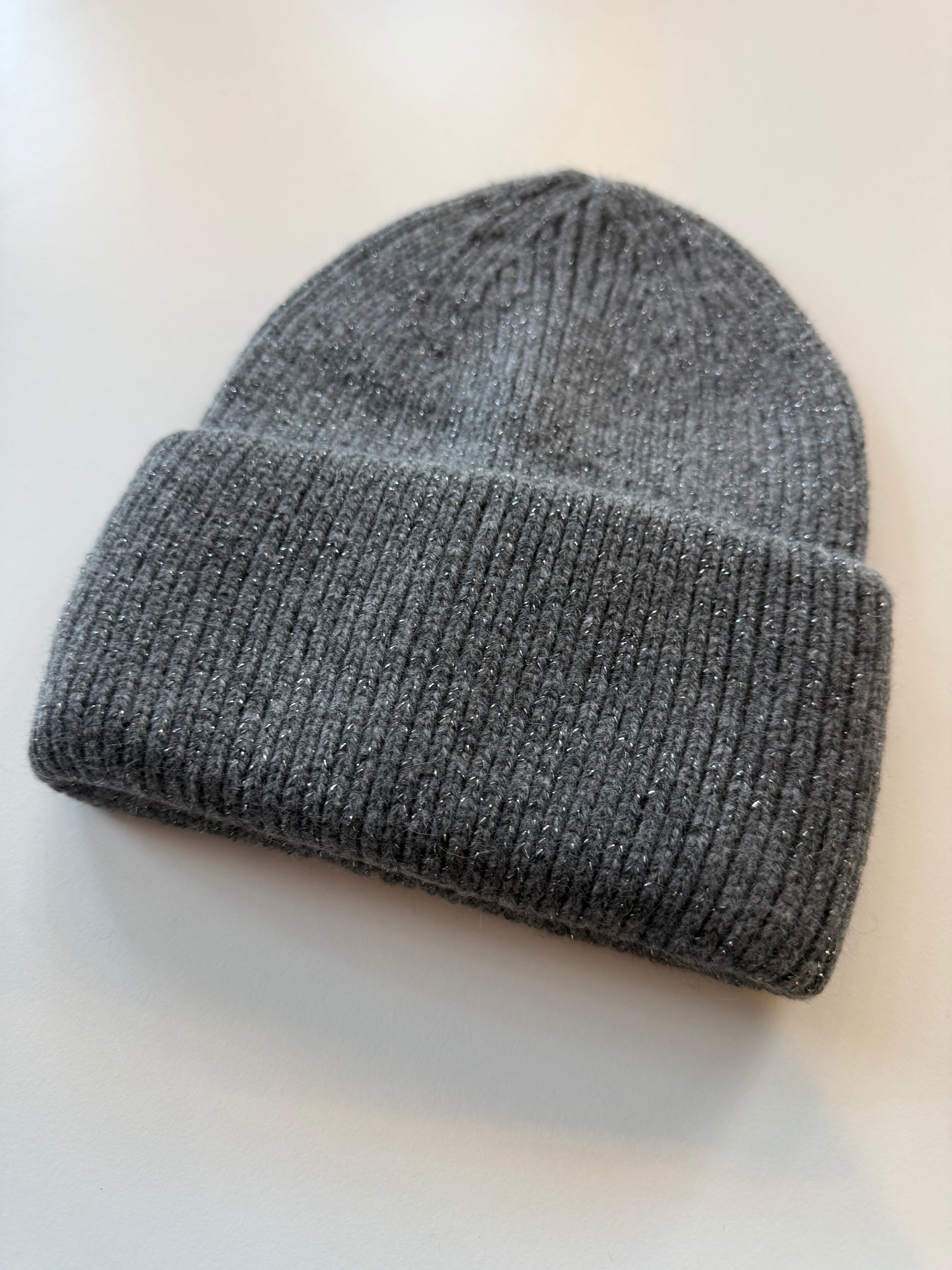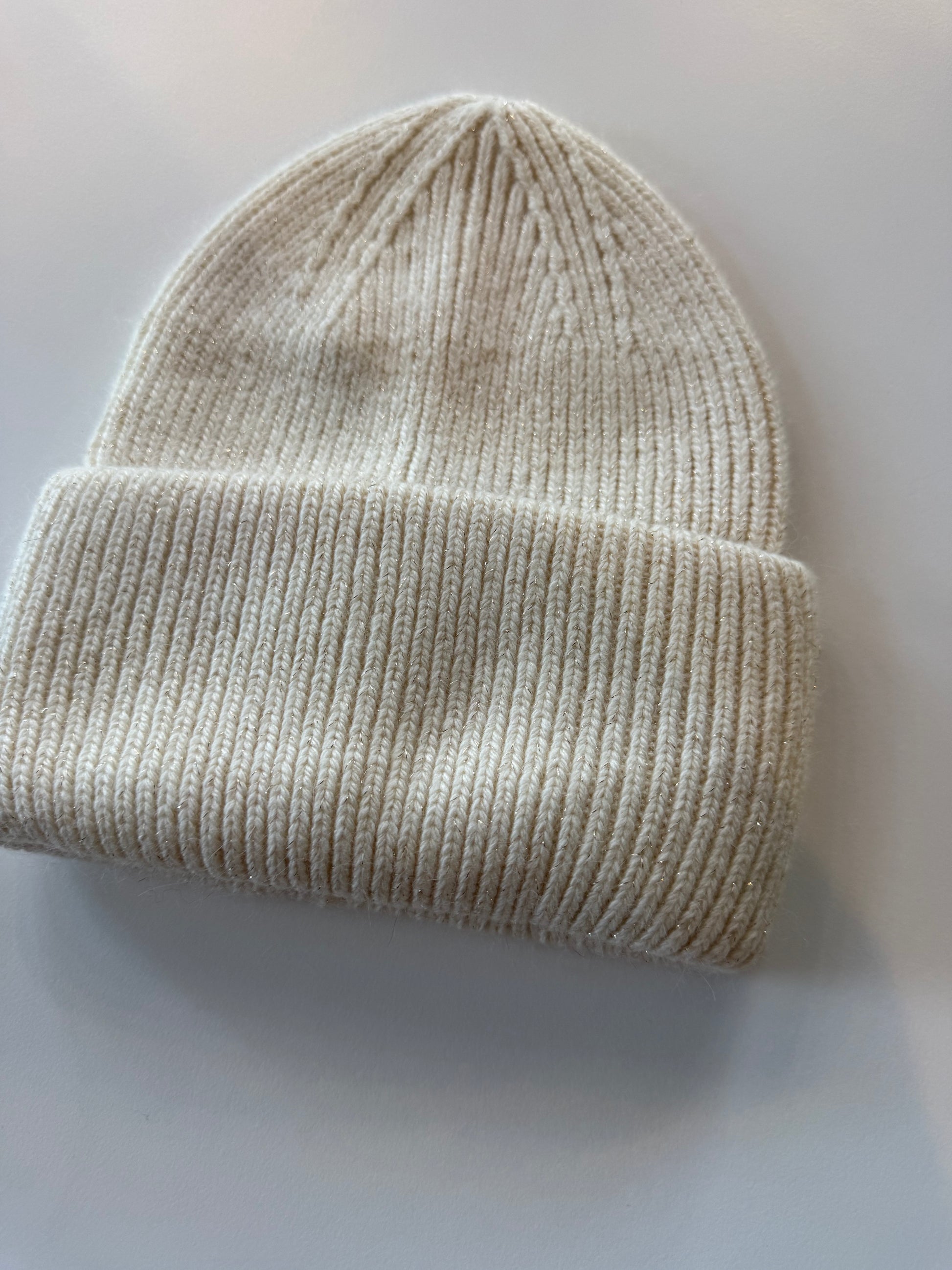 Berretto a coste morbido effetto lurex con fascia alta.