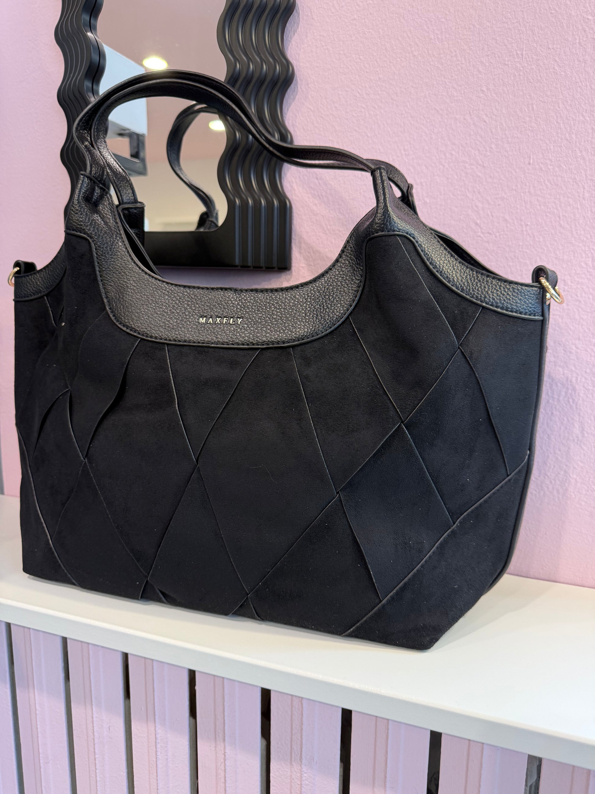 Borsa effetto camoscio intrecciata con doppio manico e tracolla.