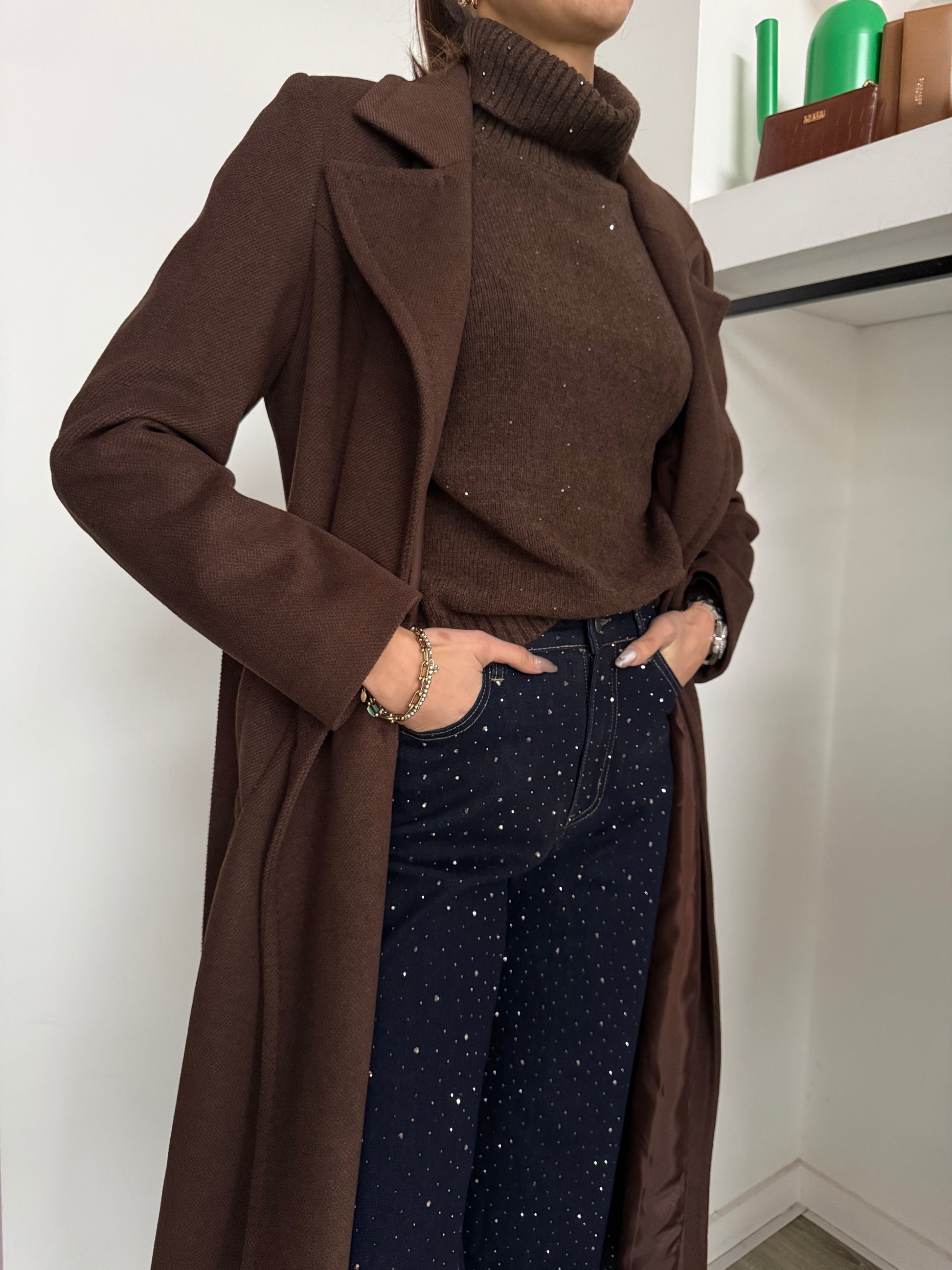 Cappotto lungo doppio petto con cintura e spacchi laterali.