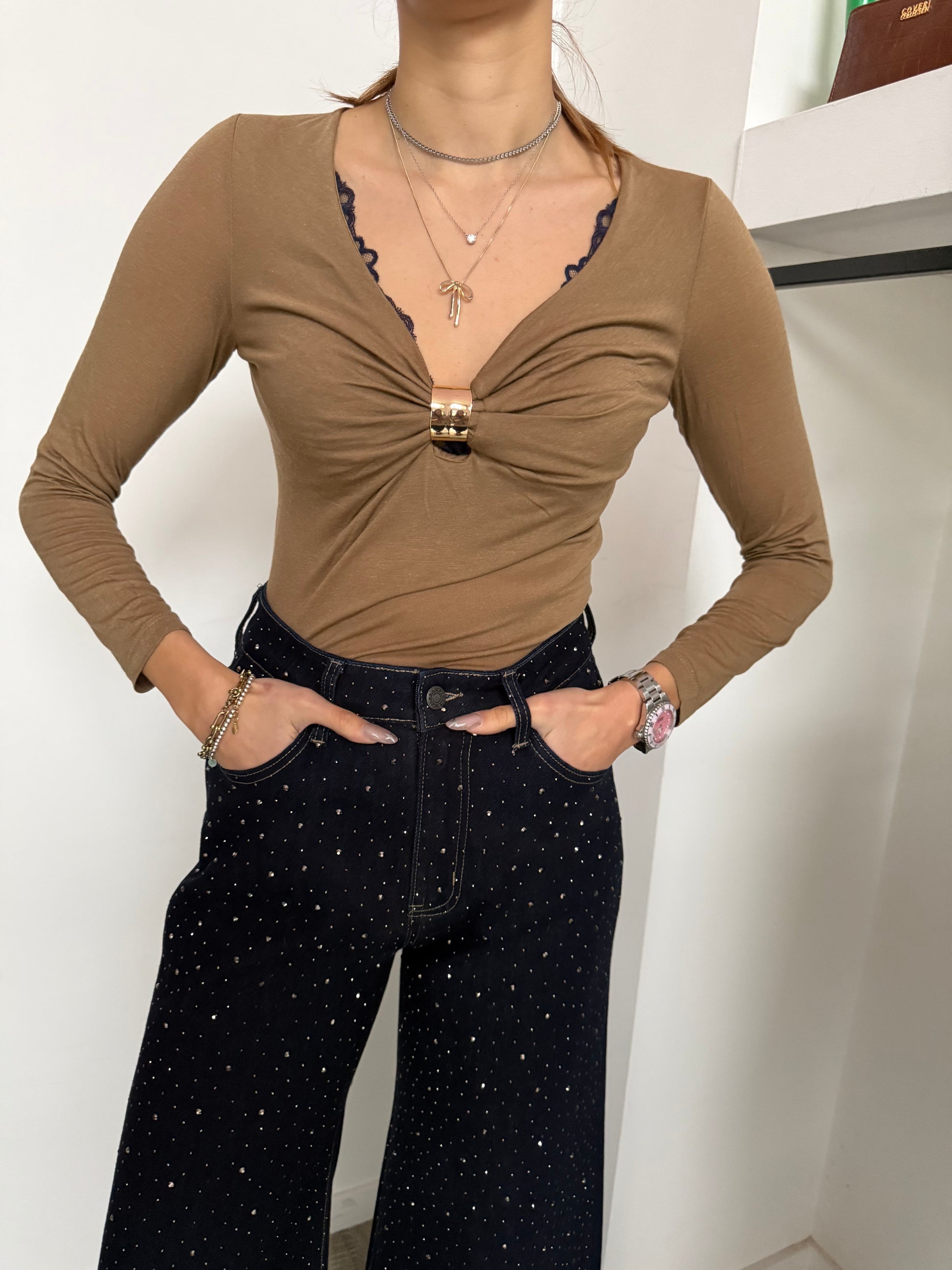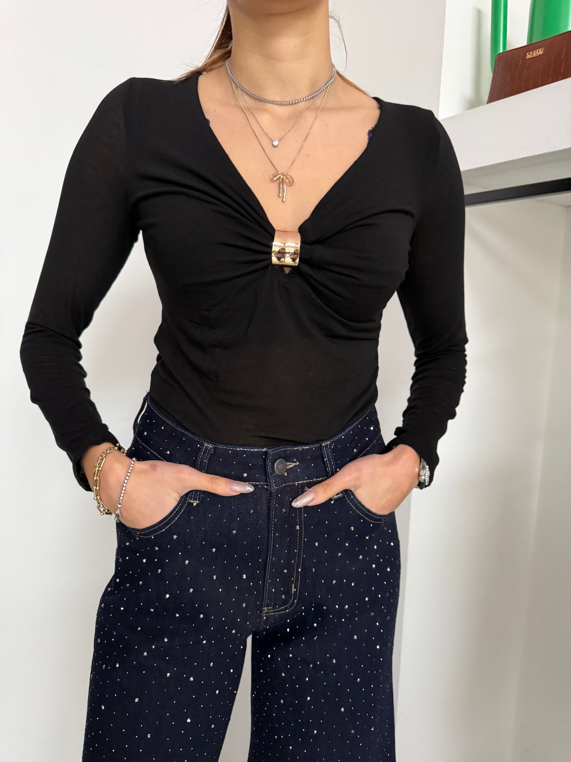 Maglietta in misto cashmere con scollo a V e dettaglio in metallo.