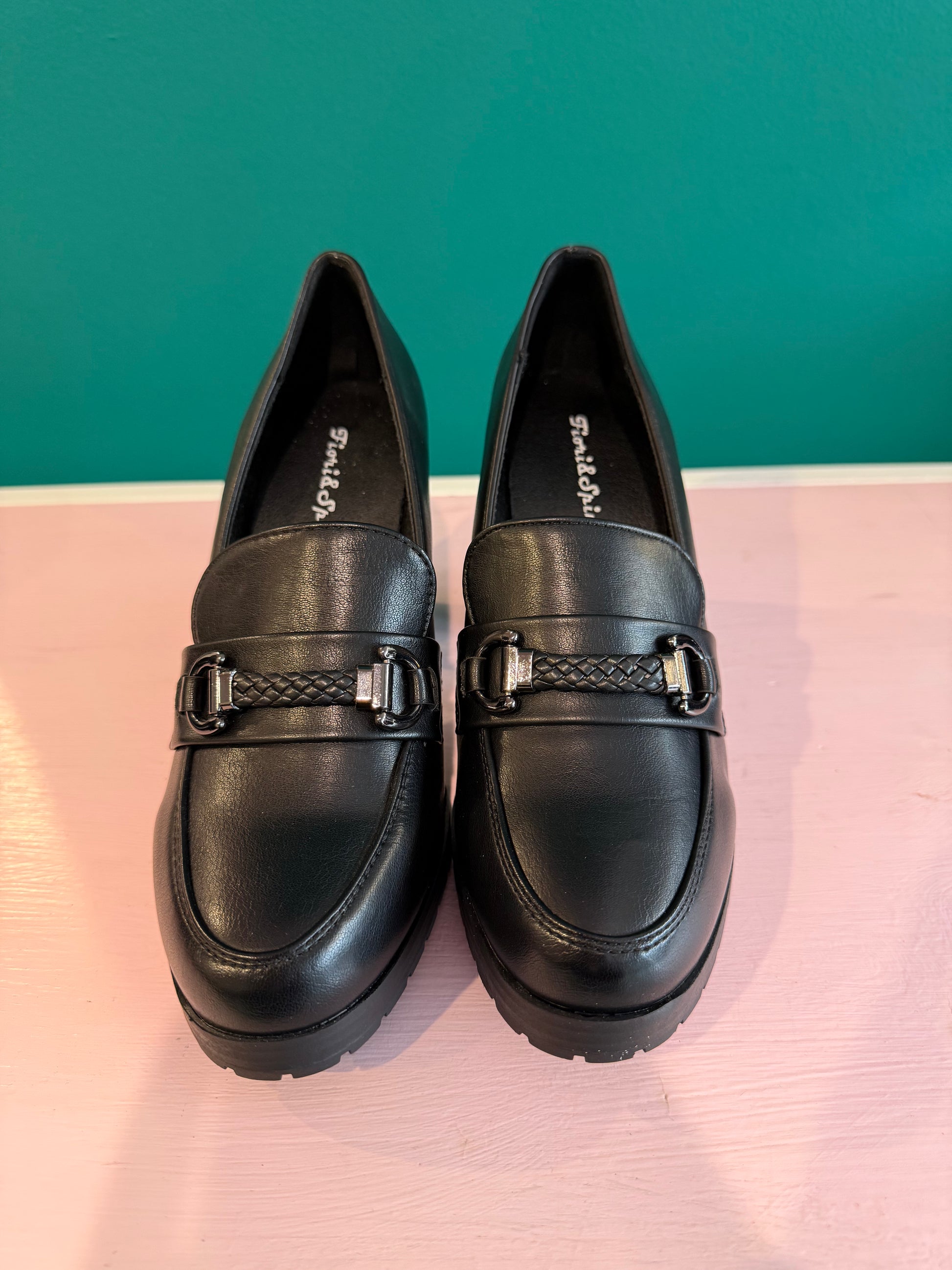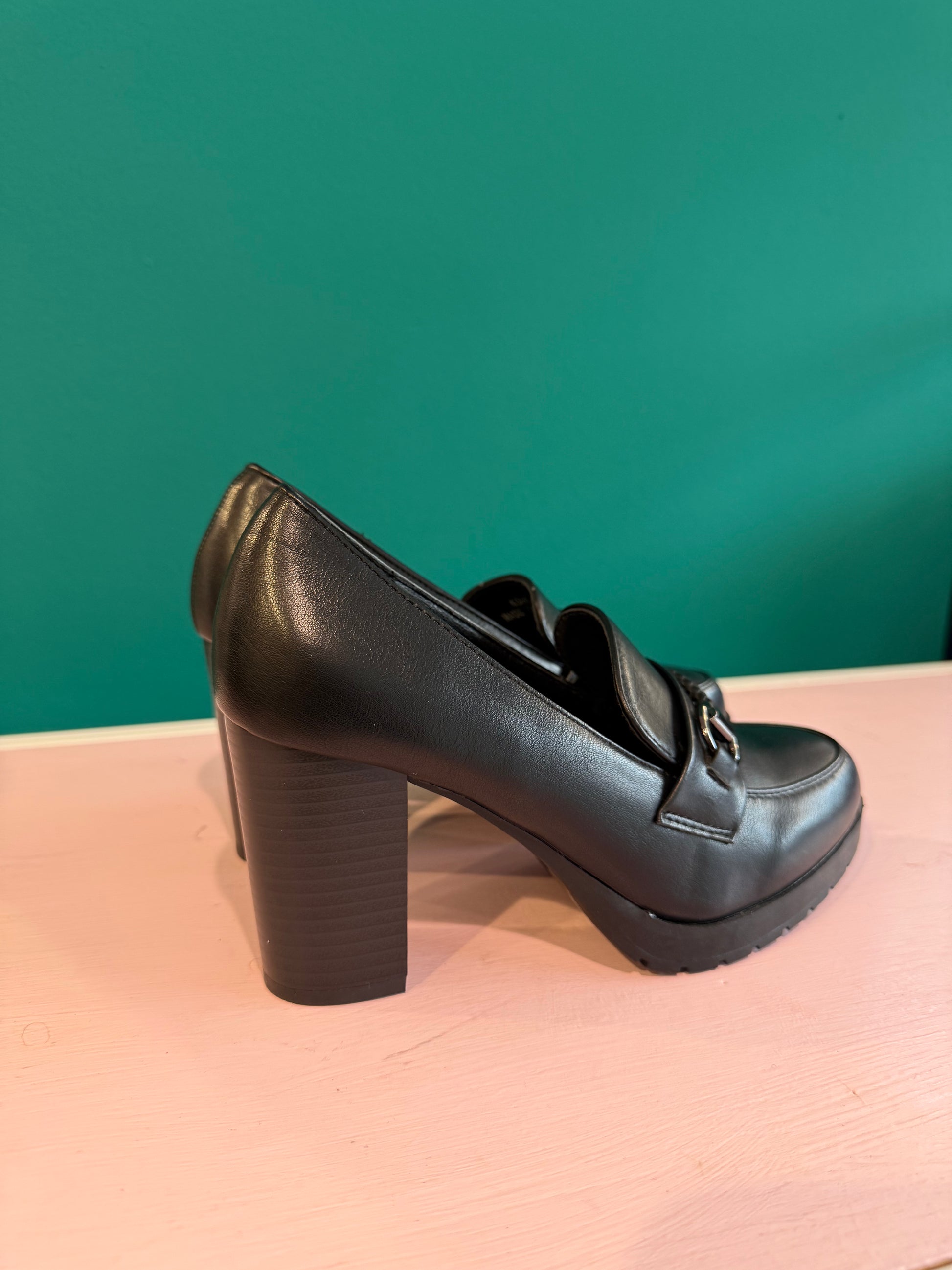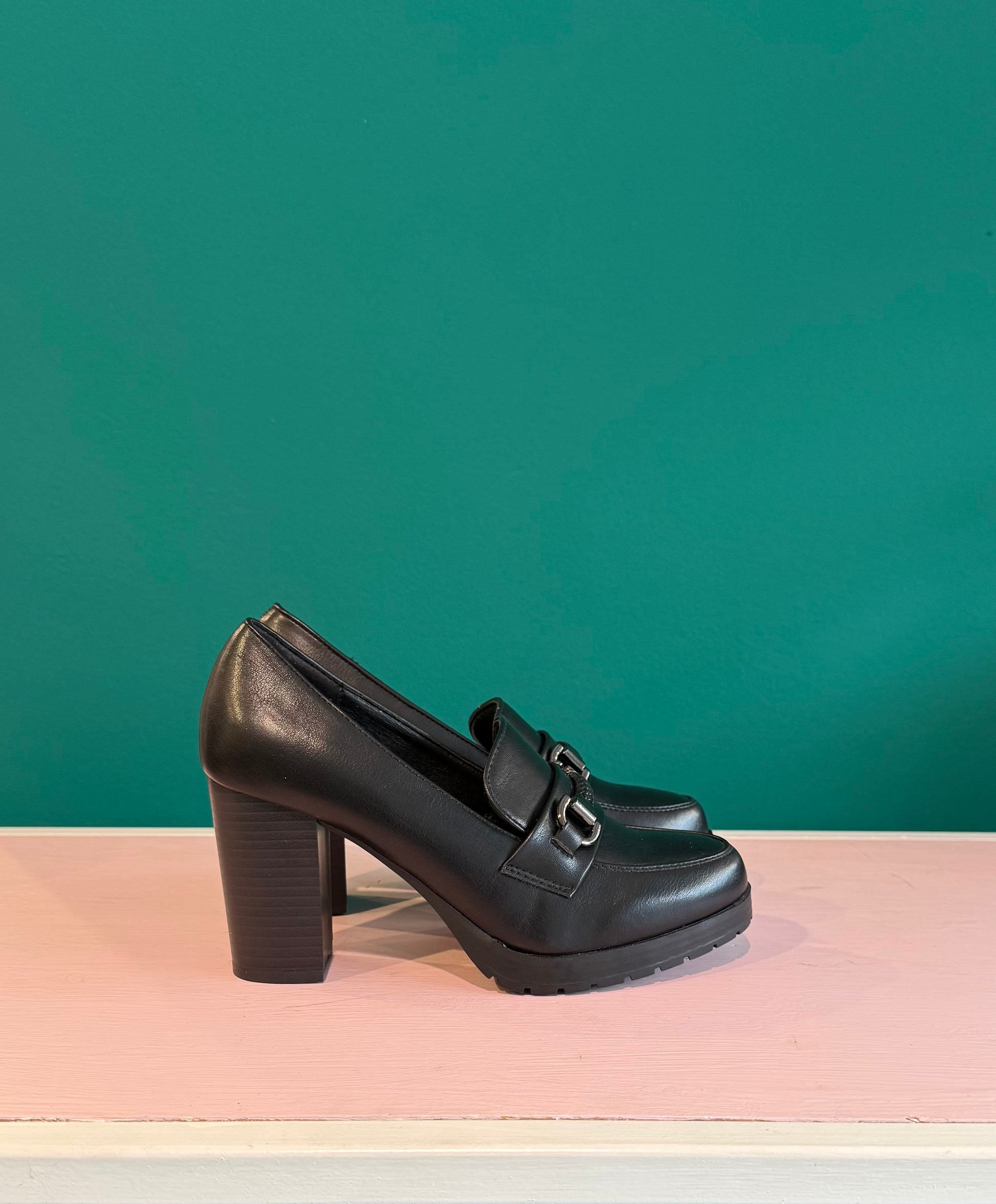 Mocassini neri con tacco alto.