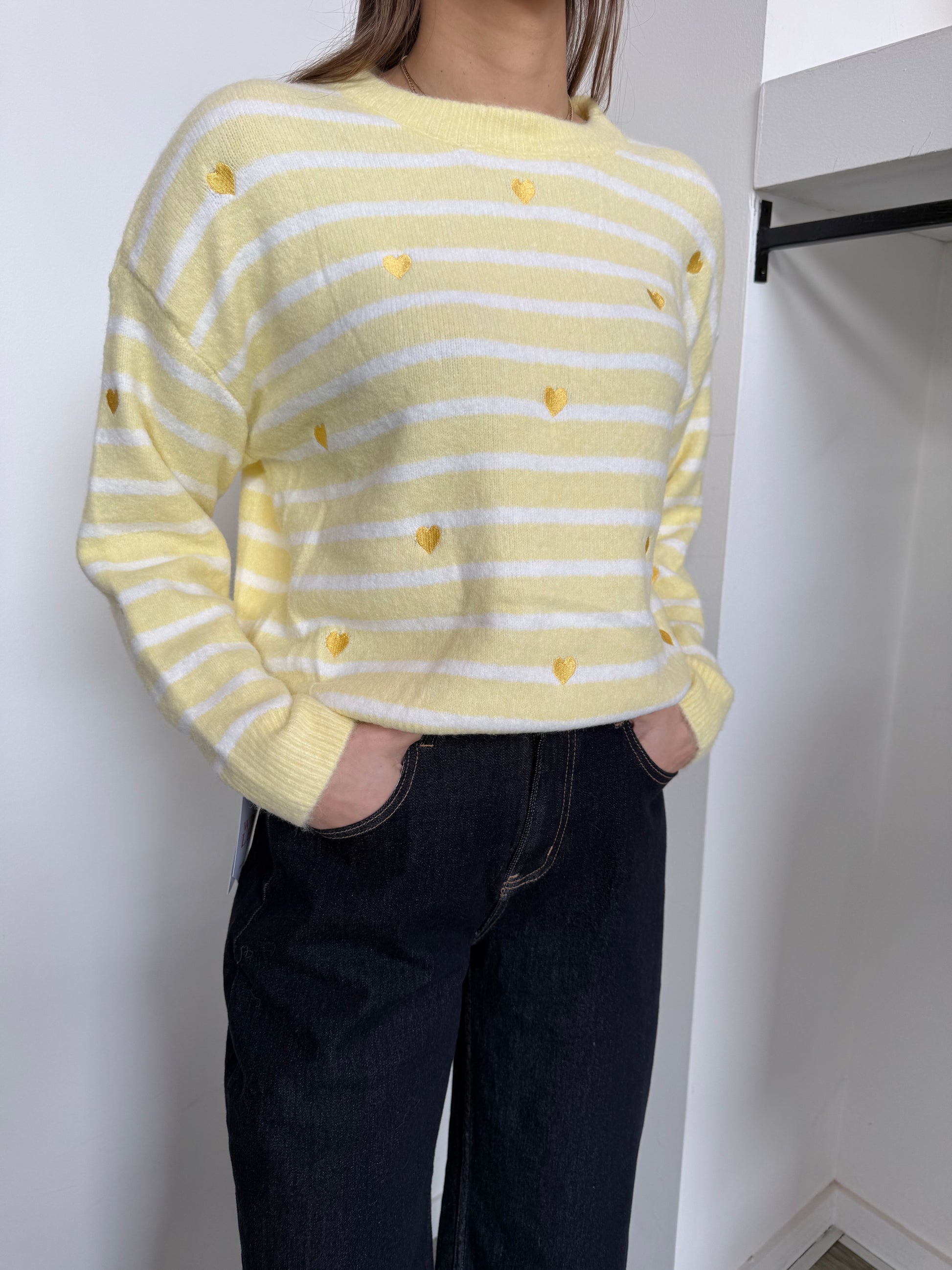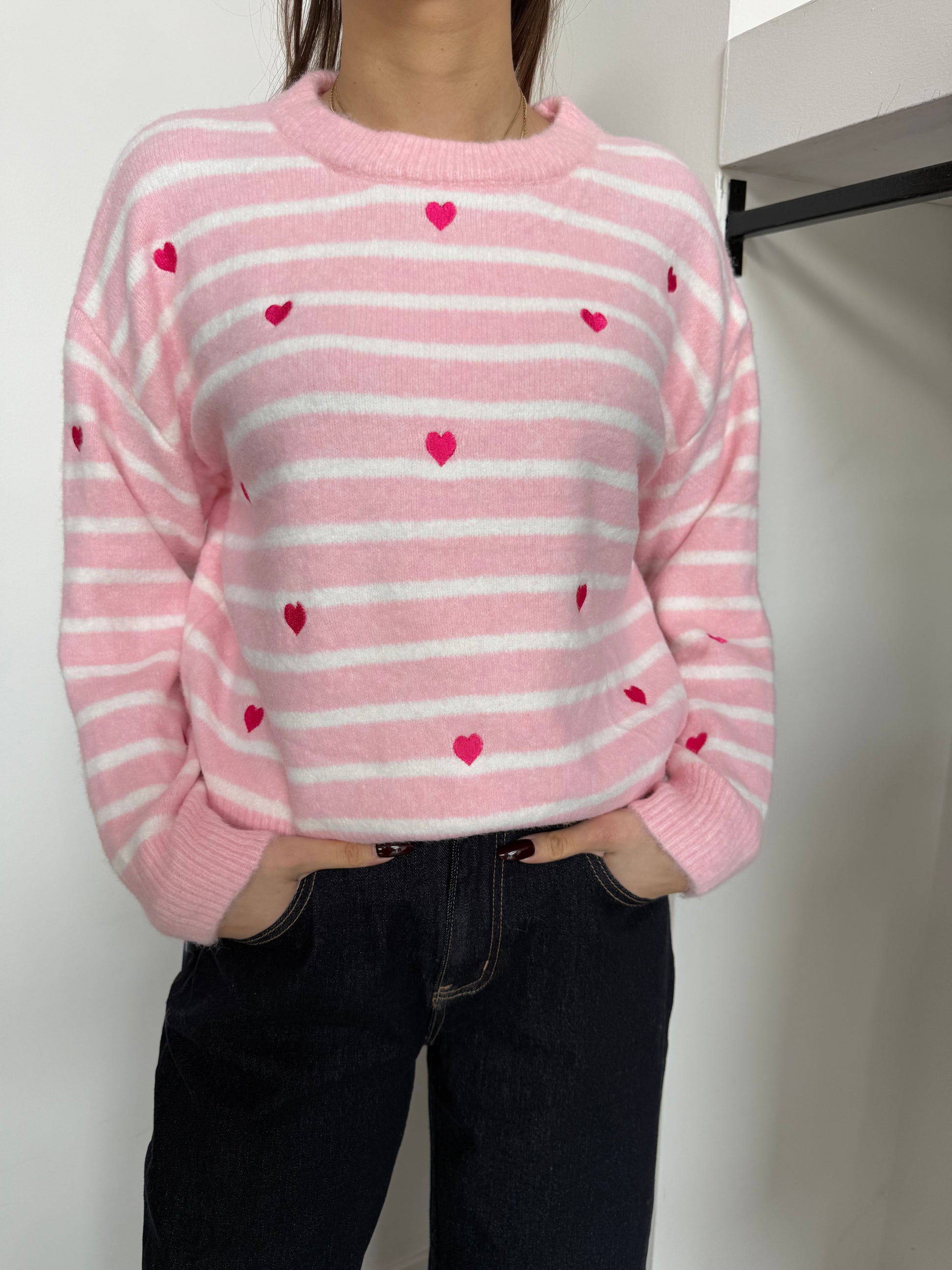 Pullover girocollo a righe e cuori ricamati.