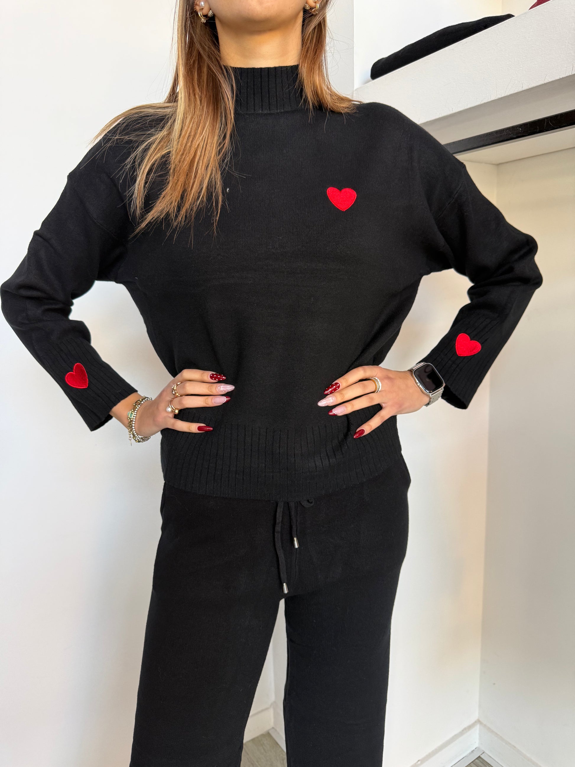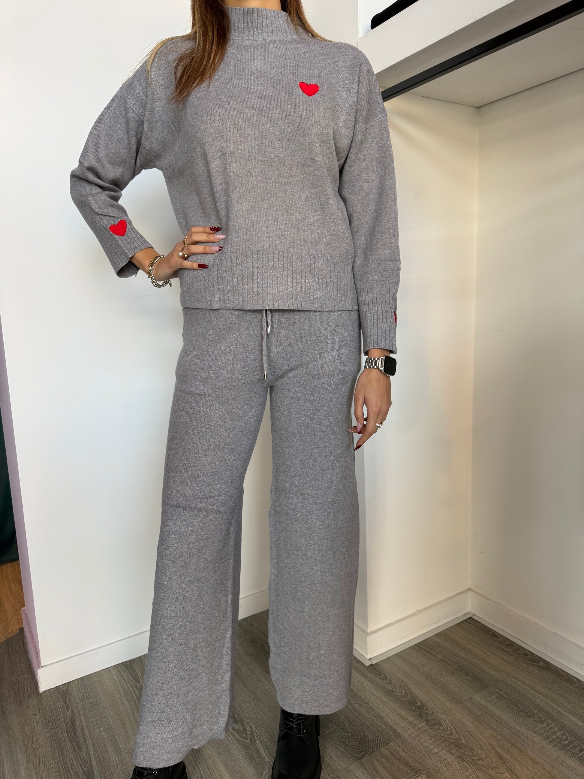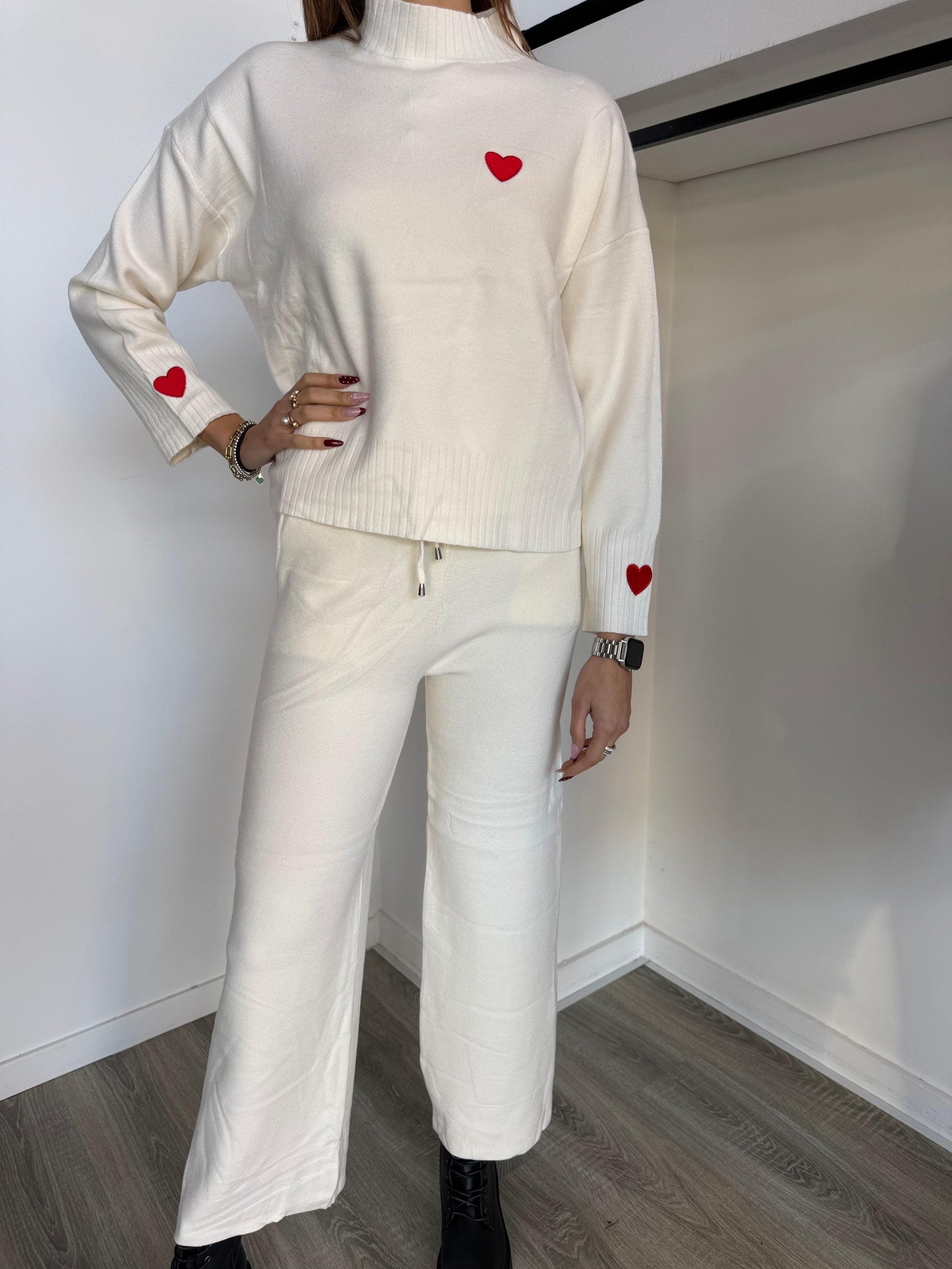Completo in maglia con cuore ricamato sulle maniche.