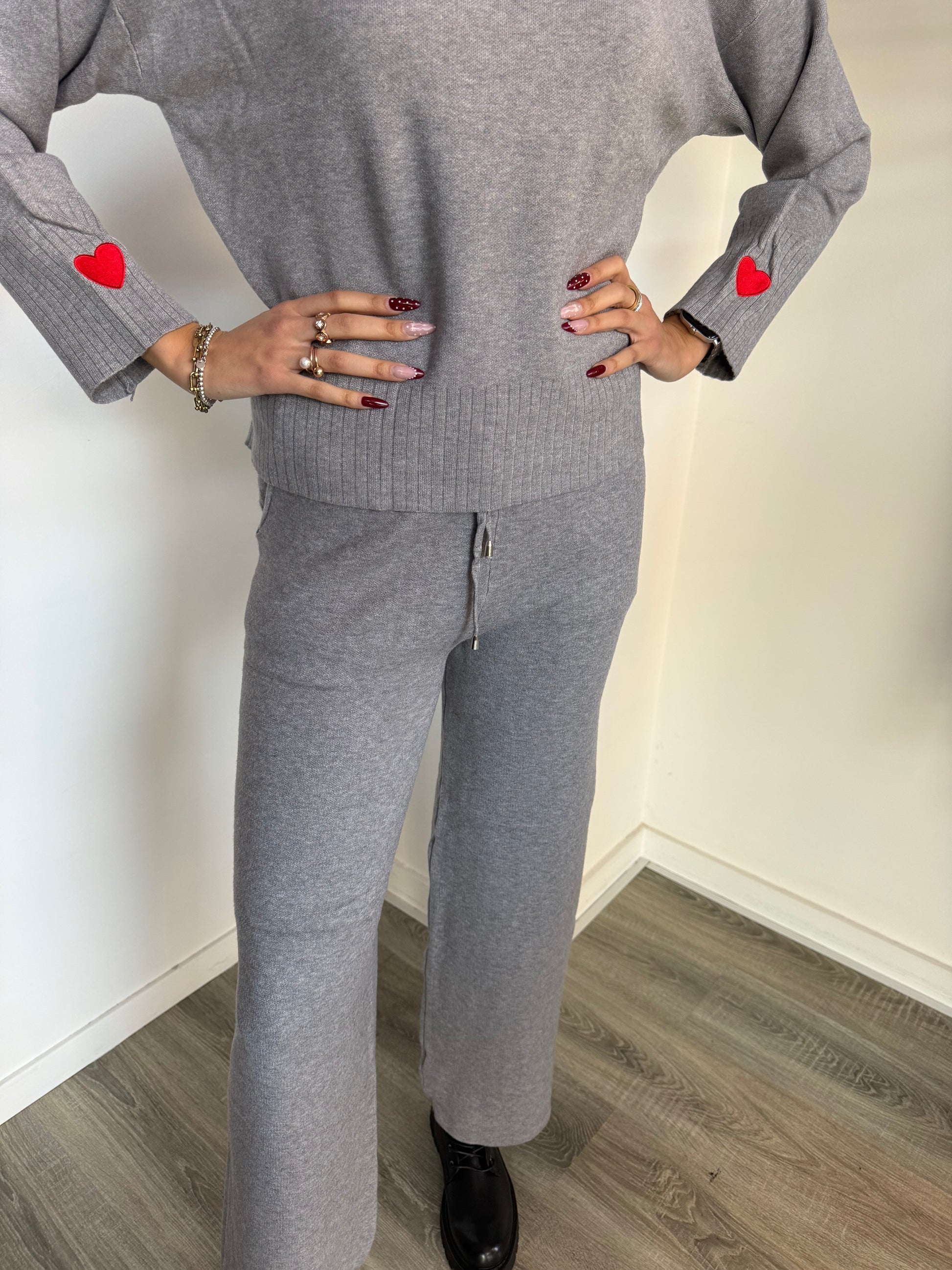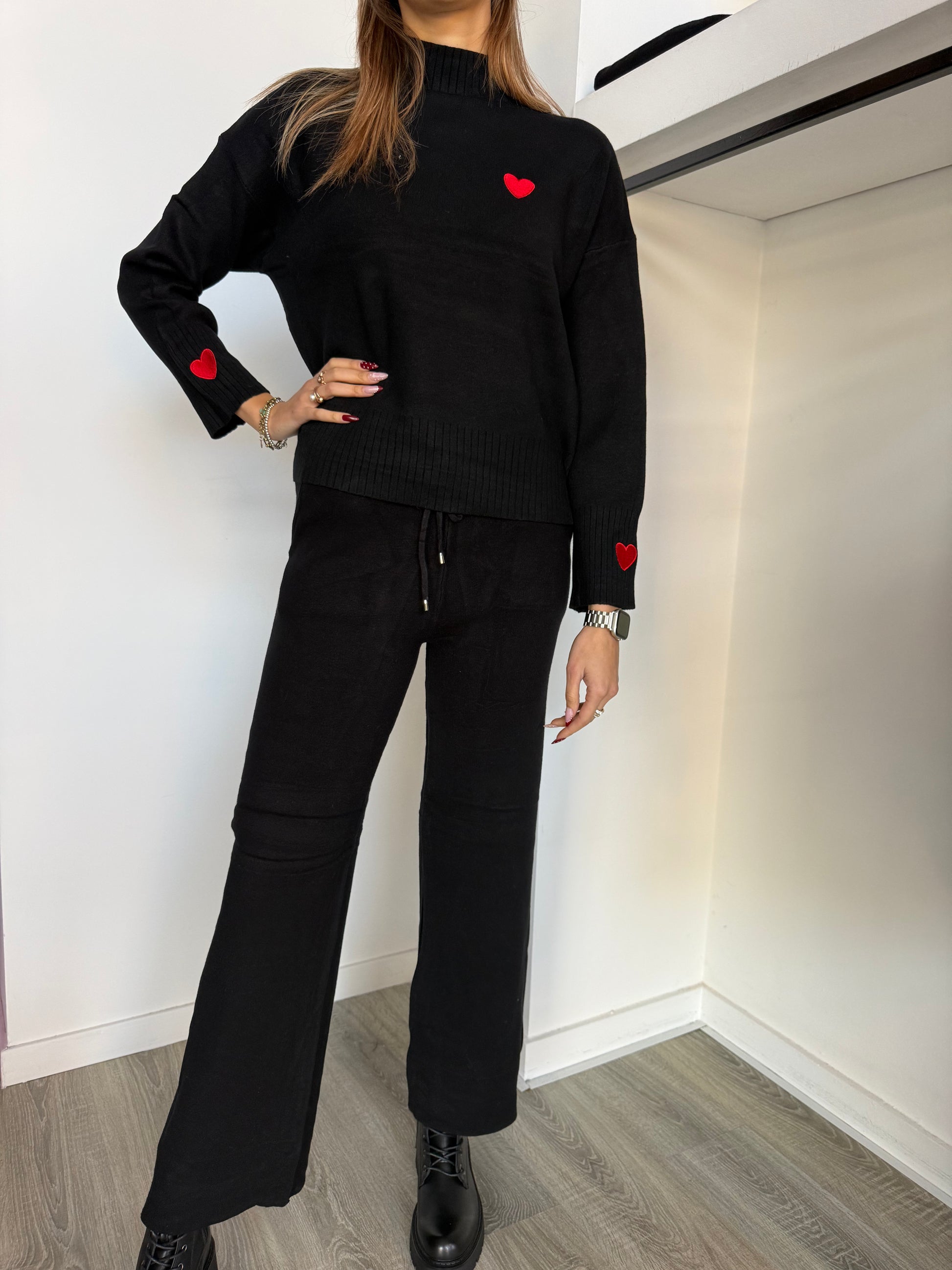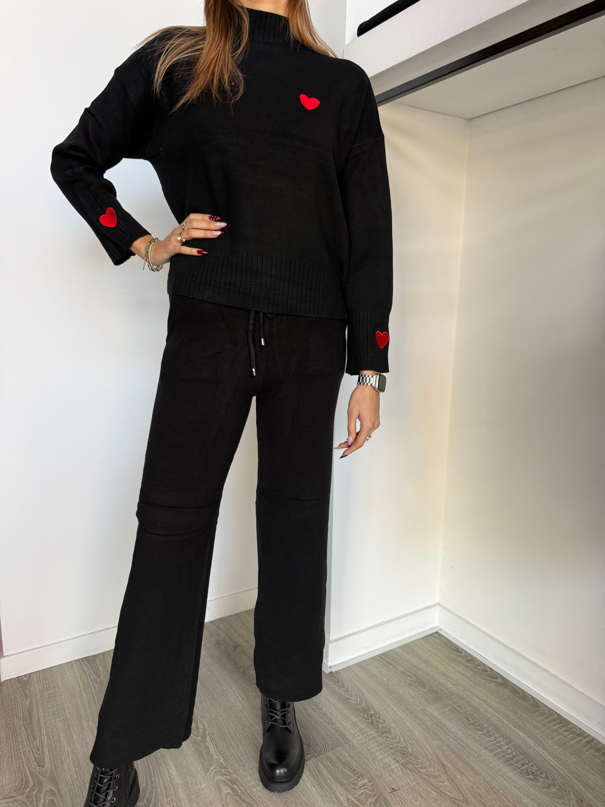 Completo in maglia con cuore ricamato sulle maniche.